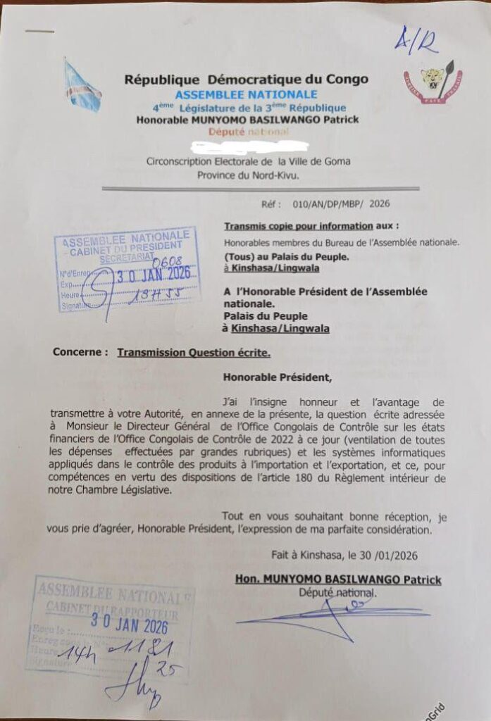 Dans le cadre de l’exercice constitutionnel du contrôle parlementaire, Patrick Munyomo Basilwango, député national élu de la ville de Goma, a officiellement transmis une question écrite adressée au Directeur général de l’Office Congolais de Contrôle (OCC), portant sur la gestion financière de cette institution publique stratégique.