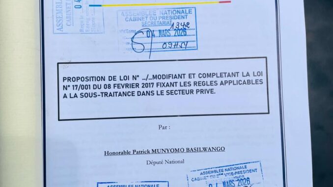 L’élu de Goma Patrick Munyomo a officiellement déposé, au bureau de l’Assemblée nationale, une proposition de loi modifiant et complétant la loi n°17/001 du 08 février 2017 fixant les règles applicables à la sous-traitance dans le secteur privé. Baptisée « Loi MUNYOMO II », cette initiative législative ambitionne de renforcer la protection de la main-d’œuvre locale et de promouvoir l’entrepreneuriat congolais.