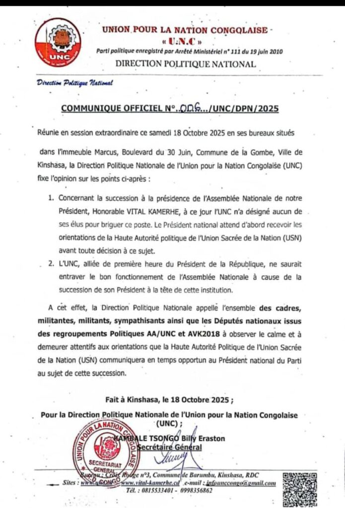 L’Union pour la Nation Congolaise (UNC) a rompu le silence ce samedi sur la question sensible de la succession de son président national, l’honorable Vital Kamerhe, à la tête de l’Assemblée nationale. Réunie en session extraordinaire à son siège de la Gombe, la Direction Politique Nationale du parti a rendu publique sa position à travers un communiqué officiel signé par le Secrétaire général, Billy Kambale.